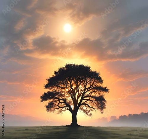 Illustration of lonely tree with sunrise behind and fogy landscape.