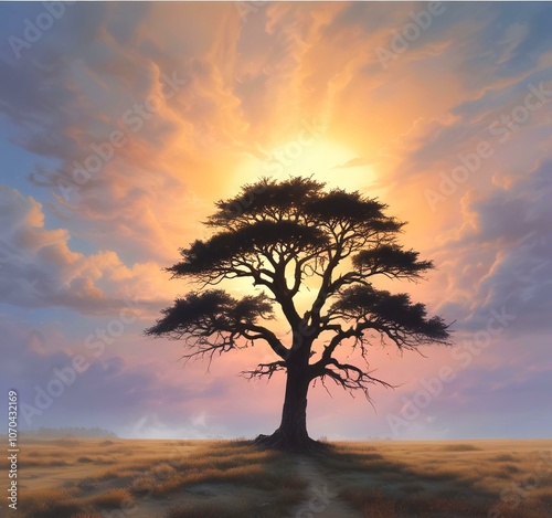Illustration of lonely tree with sunrise behind and fogy landscape.