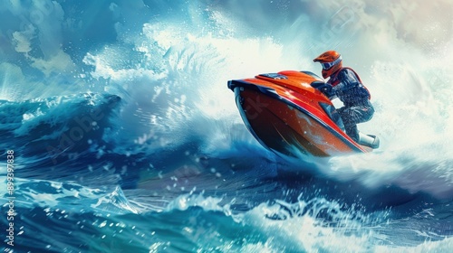 Illustration of man rider riding driving a jet ski boat on sea or ocean, water spray or splash.