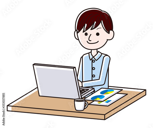 telework, telecommuting, remote, laptop, computer, cyberspace, work, network, online, office, technology, home, illustration, vector, white background, upper body, business, freelance, desk work, person, man, young