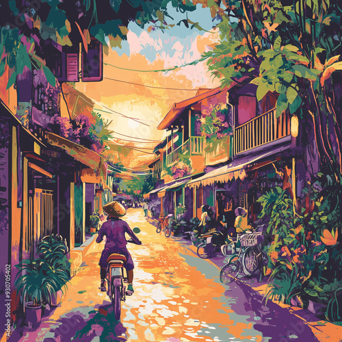 Illustration of Person Riding Scooter in Colorful Asian Street