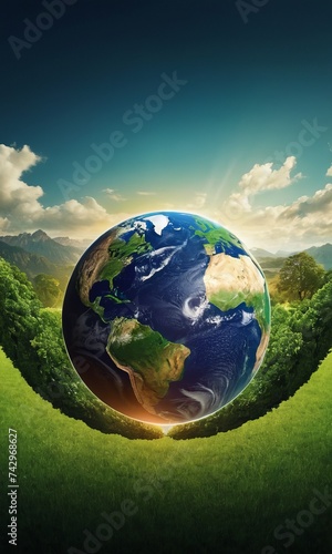 Illustration of Planet Earth on a background of trees and flowers. For posters, cards and prints. Ecology, nature, peace concept.