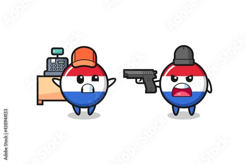 illustration of the cute netherlands flag badge as a cashier is pointed a gun by a robber