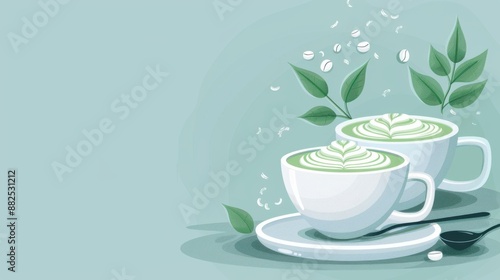 Illustration of two cups of matcha latte with latte art design, green leaves, and a spoon on a pastel green background.