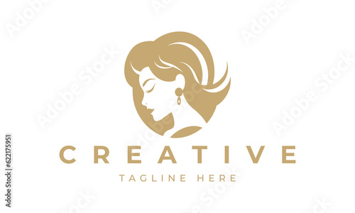 Illustration of women's hairstyle icon, logo with women's face. Vector beauty concept.