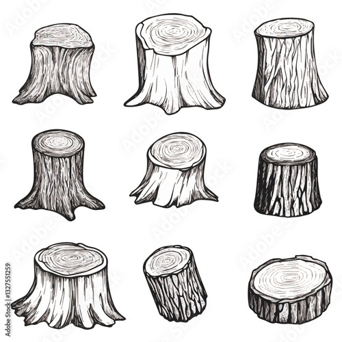 Illustration Set of tree stumps isolated. Natural cut wood