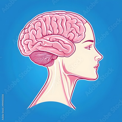 Illustration showcasing side profile of a human head with detailed brain anatomy on a blue background, highlighting neuroscience and medical concepts.