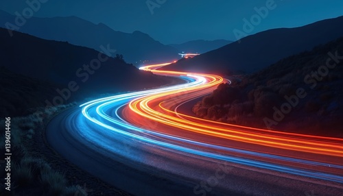 Illustration shows winding road with colorful light trails at night. Long exposure captures motion blur, vibrant colors. Futuristic modern technology concept. Digital artwork evokes travel adventure