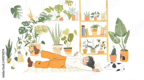 relaxing, person, lying, floor, indoor, plant, bookshelf, book, cosy, greenery, illustration, art, peaceful, serene, nature, calm, casual attire, comfort, pastel, colours, gouache, minimal, detail, foliage, calmness, lazy, cat, dog, potted, leaf, home, decor, quiet, relaxation, chill, lounging, simple, minimalistic, soft, vibrant, light, airy, environment, interior, background