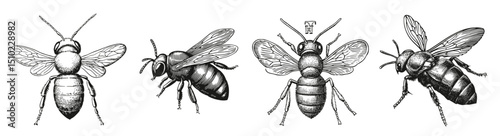 Illustrations of Various Bees in Detailed Black and White Style, Logo Design, Hand drawing Engraving, Vector Illustration Isolated Object