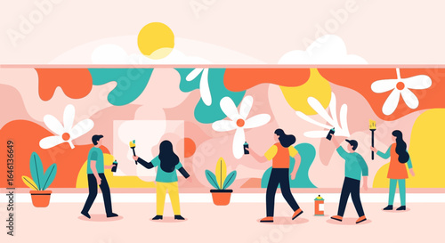 Illustrative depiction of a community art project with vibrant colors and collaborative spirit focusing on mural painting and creative expression
