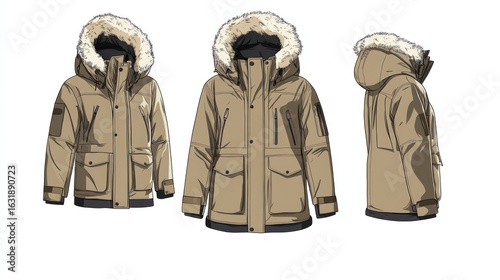 Illustrative depictions of a winter parka with fur hood trim in various angles