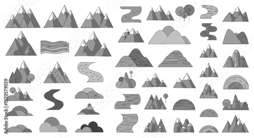 mountain, hill, river, tree, cloud, peak, snow, water, stream, landscape, nature, terrain, vale, range, summit, forest, flat, vector, icon, illustration, design, graphic, set, collection, minimalist, simple, cartoon, outline, abstract, digital, element, travel, adventure, outdoors, geography, environment, ecology, greyscale, monochrome, wilderness