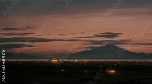 illustrazione con vista su immaginaria città futuristica in una vasta pianura, alte montagne all'orizzonte, crepuscolo