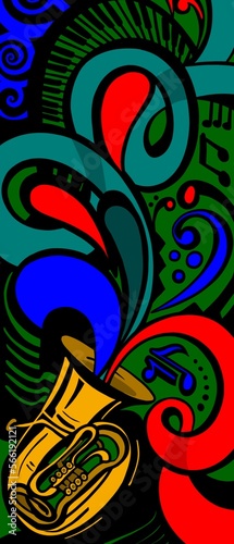 design, music, tuba, trumpet, instrument, melody, note, sound, loftiness, jazz, graphic, illustration, key, mood, music, banner, background, playing, concert, festival, vintage, colours, shape, cartoon, graffiti, wall, decoration, art, design, pattern, textured, treble clef, wind instrument, school, modern, creativity, funky, young, style, element, wallpaper, ornament, floral, symbol, swirl, seamless, furniture