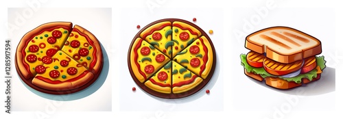 Image displays two pizzas, one sliced and one whole, alongside a grilled sandwich with visible fillings.