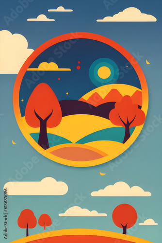 Image of a autumn landscape with trees and hills and clouds. Art deco minimalism art. (AI-generated fictional illustration)