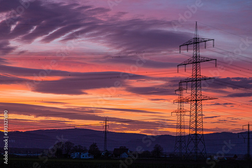 Image of a colorful and high-contrast sunrise with bright cloud formations and contours of power poles