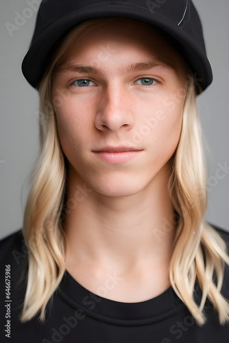 Image of a head shot of a cute white Caucasian 14 year old skater boy with long blonde hair. He is wearing a black cap.