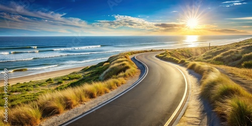 Image of a winding road leading towards a sunny beach for the summer vacation , travel, road trip, adventure, destination