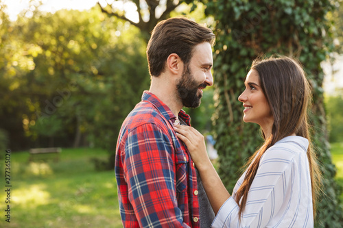 Image of caucasian couple man and woman hugging and looking at each other while walking in green park
