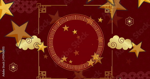 Image of chinese traditional decorations with stars on red background