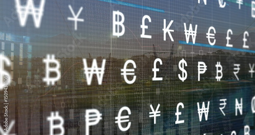 Image of currency symbols moving over cityscape