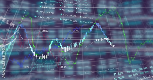 Image of financial and stock market data processing against blue background