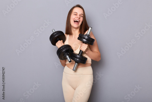 Image of laughing fitness woman wearing sportswear working out with weights, holding dumbbells in hands, expressing positive emotions, likes training in gym, posing isolated on gray background