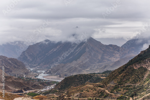 Image of mountains with green vegetation, smoke over tops, mountain river and houses at foot