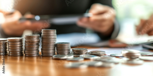 image showcases close up view of stacked coins on wooden table, with blurred hands in background engaged in financial calculations. This scene conveys sense of financial planning and investment