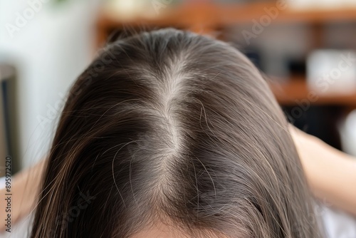 hair, thinning, parting, scalp, topview, head, closeup, hair care, beauty, confidence, modern, texture, condition, realistic, natural light, youth, dark hair, long hair, detail, middle-aged, environment, concern, depth, portrait, micro, shine