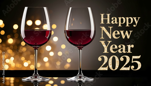 image shows 2 glasses of red wine with a blurred background of golden lights. The glasses are positioned in front of a black surface with the words "Happy New Year 2025" written in golden