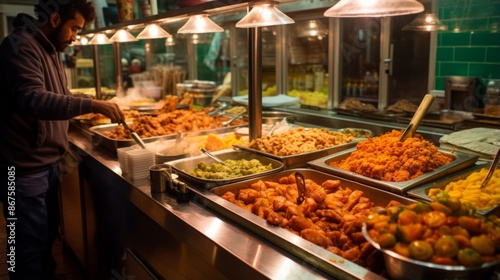 Image shows a person serving food from a buffet that features a wide variety of dishes, emphasizing the abundance and diverse selection of hot, freshly cooked food available.