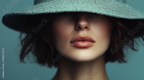 hat, wavy hair, person, texture, background, blue, muted, style, fashion, headgear, short hair, individuality, mystery, calm, serenity, aesthetic, visual, present, modern, chic, unique, trend, vintage, clothing, headwear, composition, sharpened, portrait, frame, fashionable, stylish, artistic, moody, individualism, expression, unseen, true, colours, photo, beauty, presentation, detailed, capture