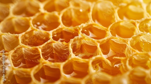 Imagine a close-up view of a luscious slice of honeycomb, captured in vivid detail against a clean, white background. The honeycomb glistens with golden hues, its delicate structure illuminated