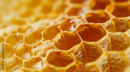 Imagine a close-up view of a luscious slice of honeycomb, captured in vivid detail against a clean, white background. The honeycomb glistens with golden hues, its delicate structure illuminated
