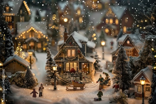 Immerse yourself in the idyllic scene of a quaint snowcovered village, alive with festive lights, cozy cottages, and cheerful townsfolk, all enveloped in a magical winter wonderland
