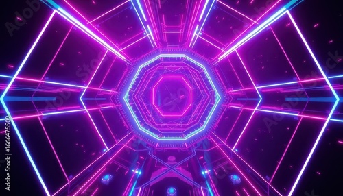 neon, light, futuristic, tunnel, corridor, geometric, abstract, magenta, blue, purple, glow, digital, cyber, symmetry, line, shape, octagon, virtual, reality, gaming, science fiction, energy, datum, network, connection, modern, innovation, dynamic, computing