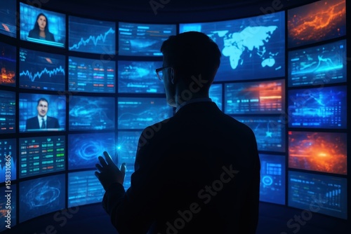 Immersive Media Experience Young Professional Engaging with a Dynamic Multi-Screen Video Wall Displaying Diverse Global News and Data Streams in a Modern Control Room