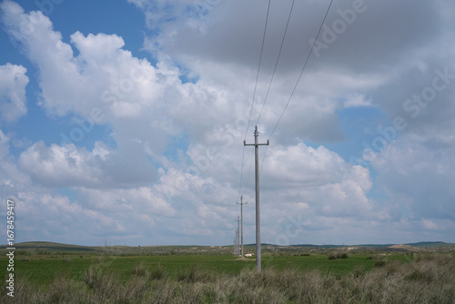 powerline, electricity, energy, infrastructure, transmission, distribution, pole, wire, overhead, electrical, voltage, current, substation, grid, utility, industry, engineering, technology, construction, landscape, rural, countryside, field, grass, green, nature, sky, cloud, daytime, weather, outdoors, scenic, view, horizon, distance, perspective, straight, parallel, line, pattern, abstract, background, setting, environment, outside, travel, exploration, discovery, power