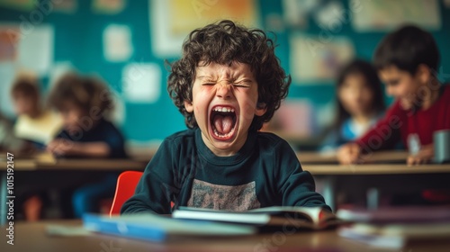 In a bright classroom, a boy with curly hair loudly expresses his feelings while peers focus on their books, creating a lively learning atmosphere