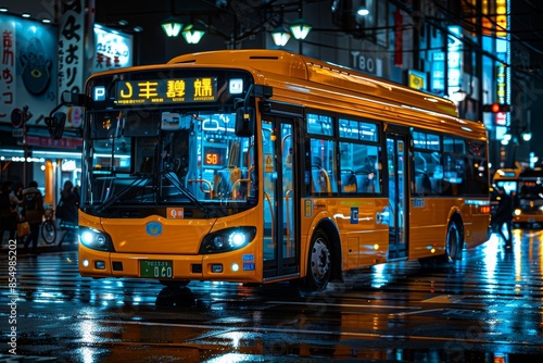 bus, city, night, neon, orange, transportation, public, illuminated, urban, light, street, wet, vehicle, japan, downtown, travel, city landscape, tied-up, electric, passenger, headlamp, signage, asian, modern, commuting, rain, glow, vibrant, metropolitan, technology