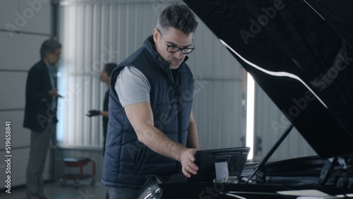 mechanic, inspect, engine, tablet, work, diagnostic, repairing, testing, maintenance, check, fix, repair, car, automobile, vehicle, hood, bonnet, service, technology, industrial, digital, automotive, asian, men at work, employee, consult, client, manager, technician, breakdown, equipment, job, occupation, device, contraption, modern, contemporary, mechanical, manufacturing, factory, repair shop, warehouse, workspace