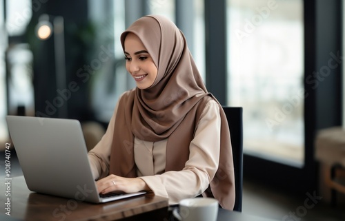 In a cozy cafe, a woman in a hijab embraces modernity as she diligently works on her laptop, seamlessly blending technology with tradition in a contemporary and culturally diverse workspace