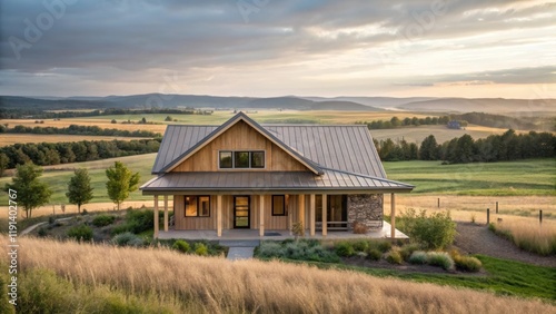 In a rural setting a medium closeup captures a newly built ecofriendly home nestled a sprawling fields harmonizing with the landscape through the use of natural materials and