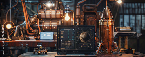 In a scene reminiscent of a Victorian-era laboratory, a steampunk space rocket is poised for liftoff, its brass fittings and rivets contrasting against the minimalist background. A laptop screen