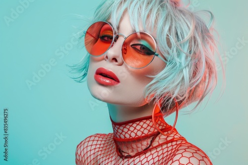 woman, adult, senior, caucasian, bold, individualist, confidence, adventurous, audacity, white hair, sunglasses, colourful, necklace, jewellery, lipstick, rebellious, fashion, red, indoor, people, shirt, mesh, 1, vitality, visionary, day, alone, look, originality