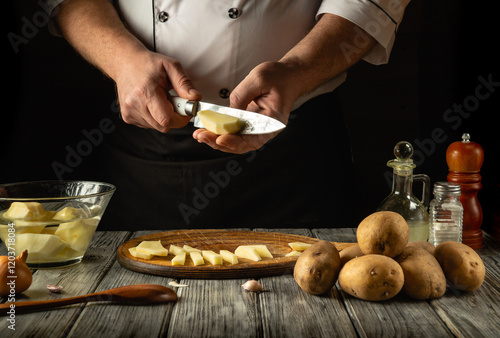 In a warmly lit kitchen, a skilled cook carefully slices fresh potatoes, preparing for a delicious meal. European cuisine