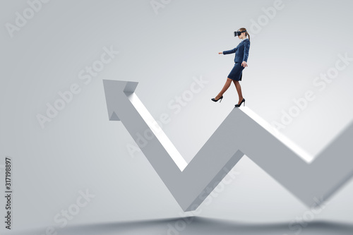 using, reality, businesswoman, arrow, growth, progress, financial, success, virtual, female, technology, professional, helmet, mask, woman, fearless, emotion, life events, walk, new, innovative, another, caucasian, communication, datum, digital